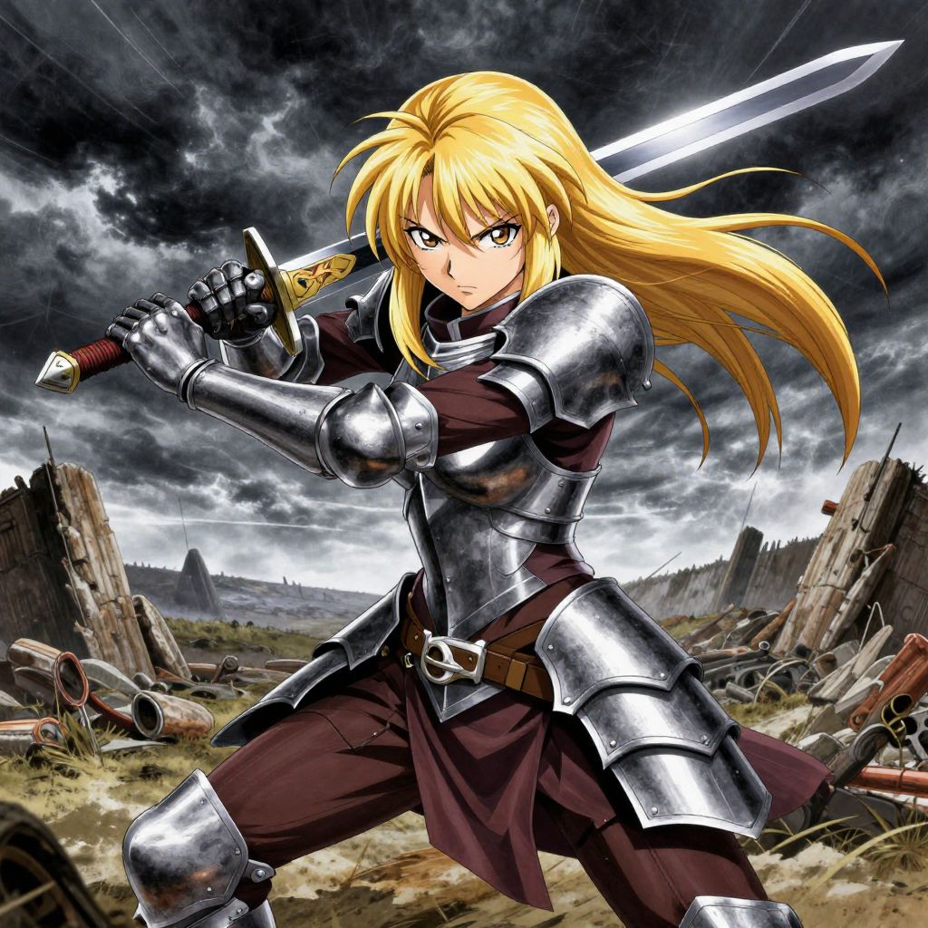 Digital anime-style artwork: fierce, blue-haired warrior woman with sword, dark armor, and thigh-high boots stands on rocky shore before stormy seas and