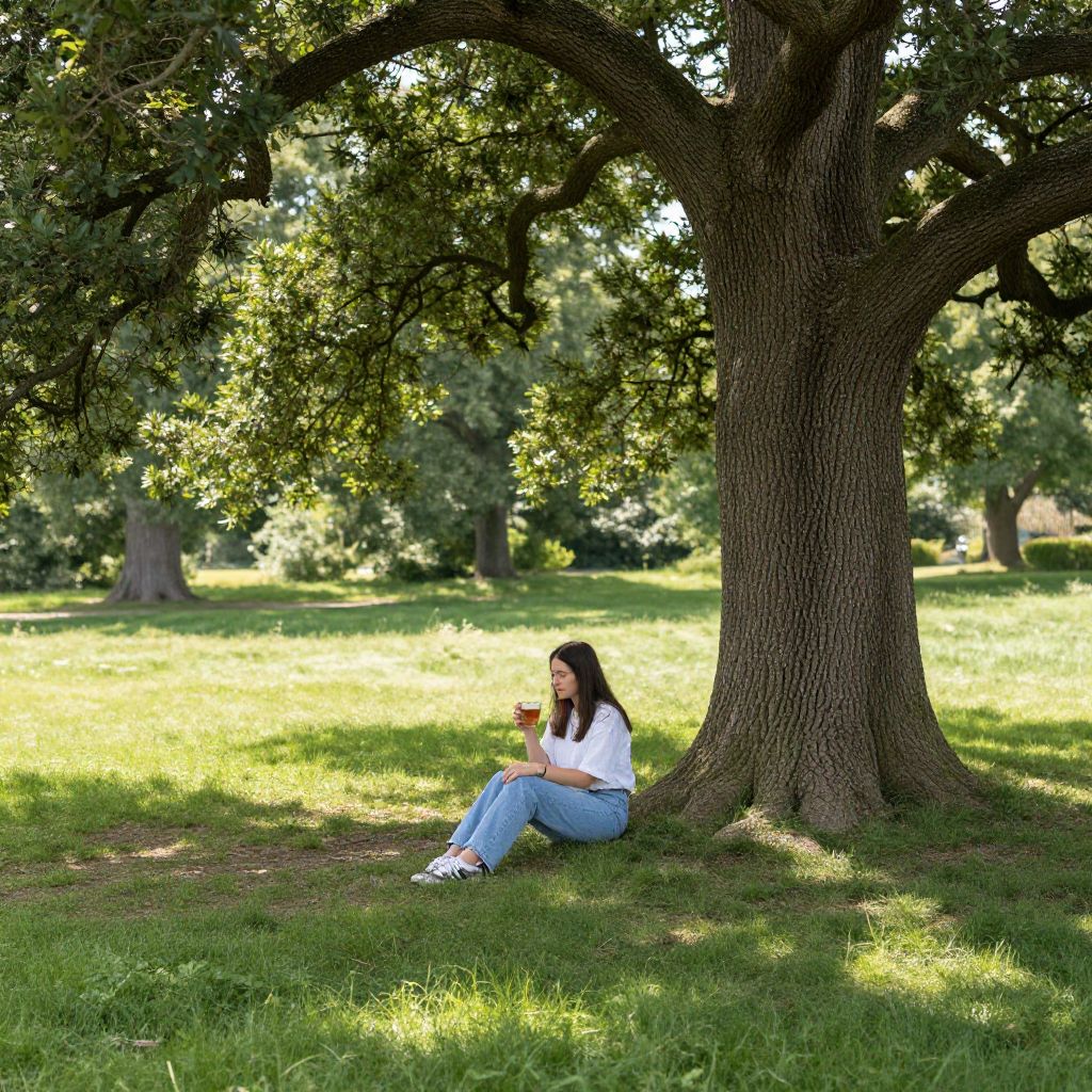 Woman sitting under a large oak tree in a serene park, holding a cup of tea while surrounded by lush green grass and dappled sunlight filtering through the branches.