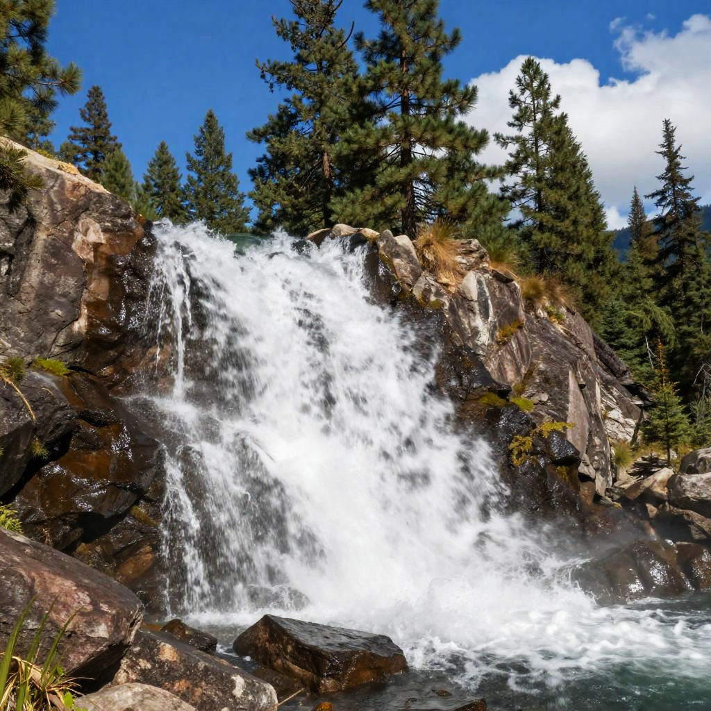 Photograph of a vibrant waterfall cascading over rocky terrain. The water flows smoothly over dark, textured rocks, creating a white, misty effect. In the background, tall pine trees and a clear blue sky with a few clouds are visible. The scene is rich with natural colors, including greens, browns, and blues, capturing a serene and picturesque outdoor setting.