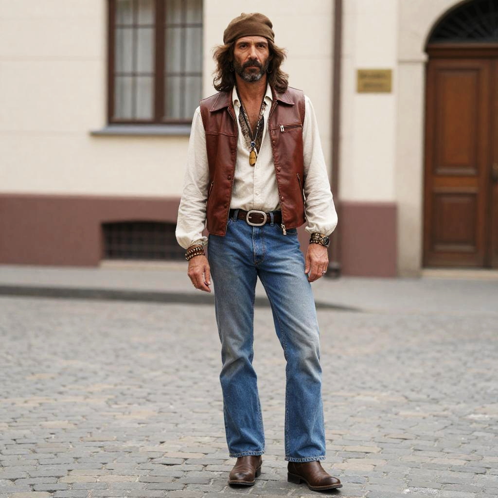 70s Man Fashion Hippie, man in a leather vest and jeans standing on a cobblestone street