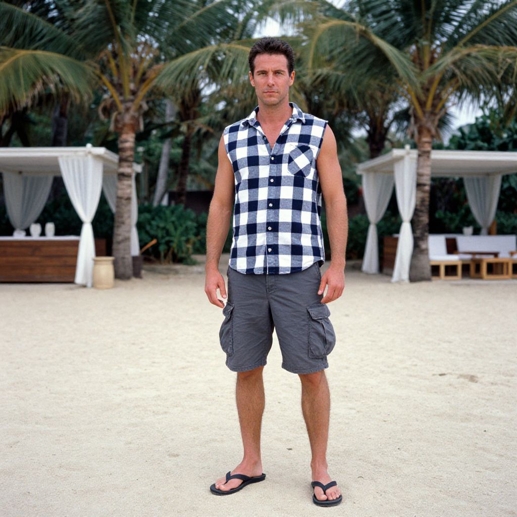 A man, navy and white checkered sleeveless flannel, charcoal gray cargo shorts, classic black flip-flops, sandy beach, swaying palm trees, open-air wellness spa, Ilford film stock, relaxed expression, enjoying the summer vibe. Man has masculine face and piercing eyes