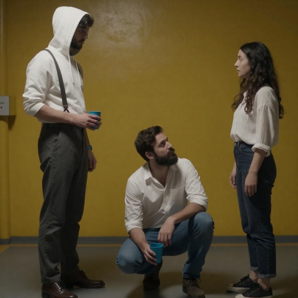Photograph of a dimly lit hallway with white walls and dark gray tiles. A pregnant woman with long brown hair, wearing a brown sweater and blue jeans, stands in the foreground, looking serious. A bearded man in a black shirt and pants stands in the background, near a white door. A brown paper is affixed to the right wall.