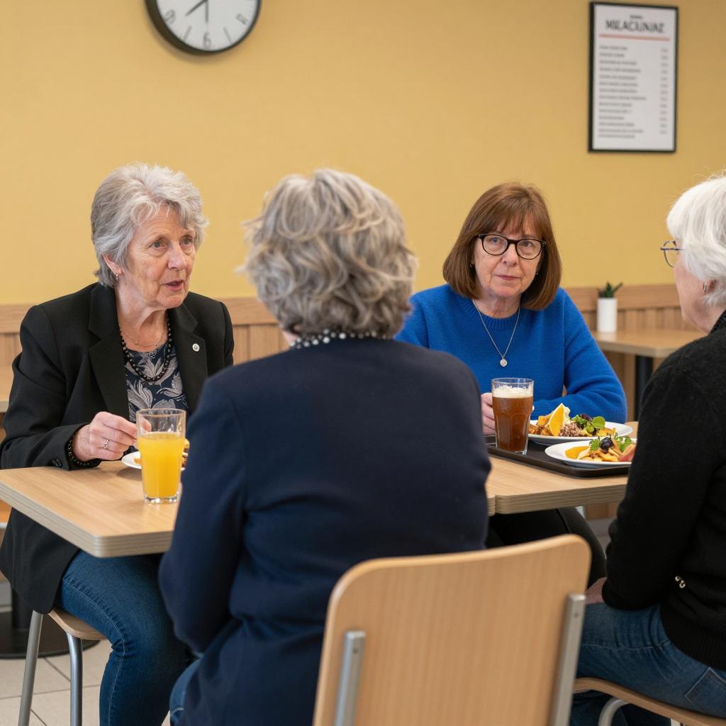 Four older women at a cafeteria table. One woman with short gray hair in a black blazer sits on the left, talking. Another woman with short gray hair, back to camera, sits in the center. A third woman with brown hair and glasses in a blue sweater sits on the right, looking at the camera. A fourth woman with white hair, partially visible, sits on the far right. The table has food, drinks, and a tray. A clock and a sign are on the yellow wall in the background.
