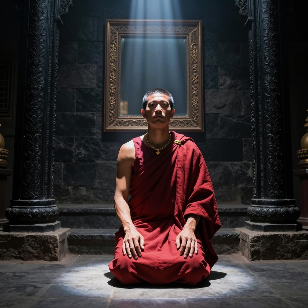 Group of monks in black robes dancing around a monk in a red robe with a gold belt in a stone-walled room. Central monk points forward, others raise hands. Six monks in black, one monk in red. Background includes stone stairs and chandelier. Monks have varied facial expressions, some smiling, others focused.