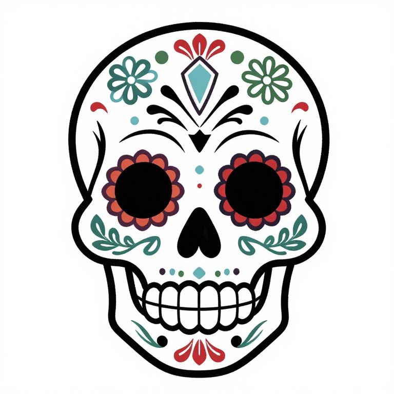 Symmetrically detailed sugar skull illustration featuring intricate floral patterns, bold geometric shapes, and ornate designs adorning its forehead, eyes, nose, and jawline, set against a clean white background.