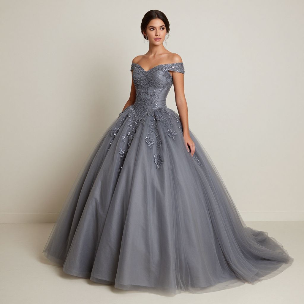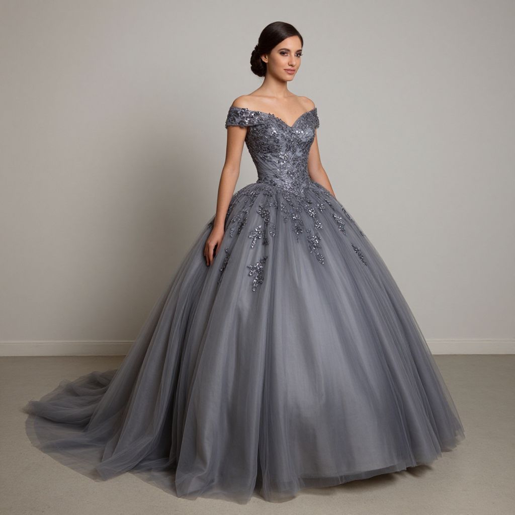 Elegant woman standing against a plain wall, wearing a custom-made gray tulle quinceañera dress adorned with floral sequin embellishments, featuring a fitted bodice and a flowing skirt that cascades gracefully to the ground.