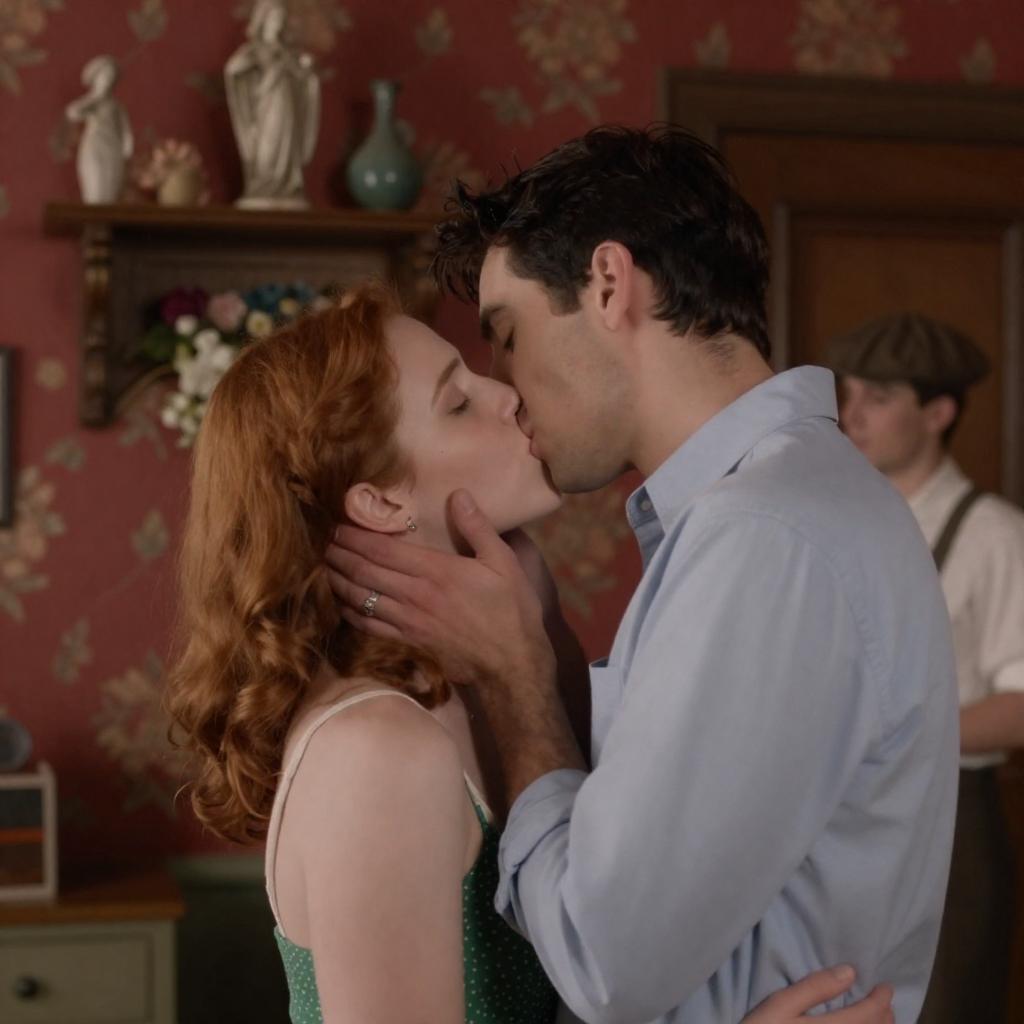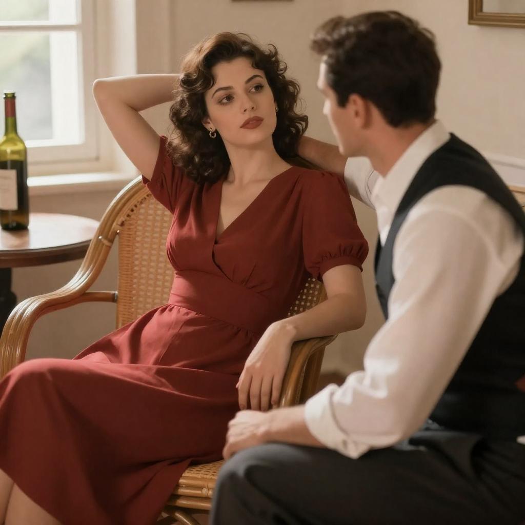 Illustration of a woman in a red dress and cap, leaning over a man in a checkered jacket and bow tie, giving him a kiss on the forehead. Man's eyes are closed, woman's eyes are focused. Background includes boxes and a metal bucket. Man holds a hand to his head. Both have intense expressions. Woman's hand rests on man's forehead. Boxes labeled "Papier" in the background. Red and brown color palette.