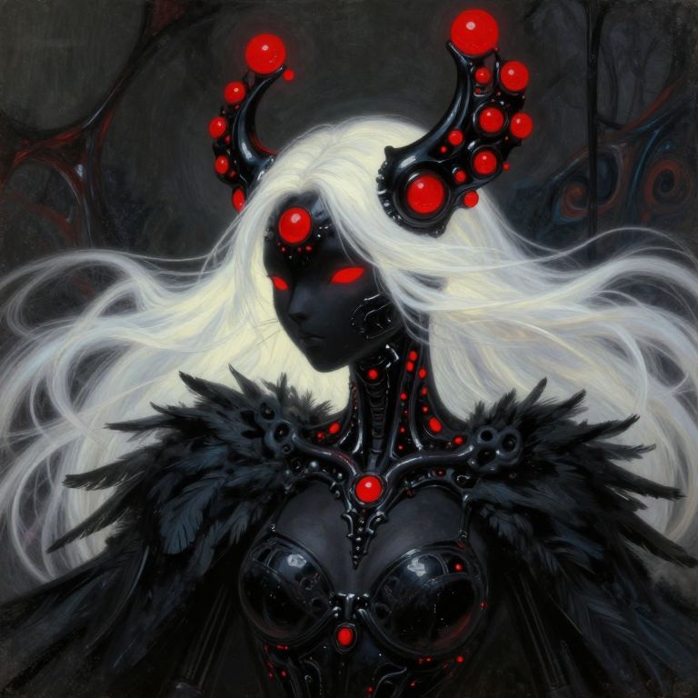 Dutch angle, view from below, A woman with shrouded hair and a cascade of billowing, feathered cloak, stands in a dynamic, organic environment, as if transported from a dream, Her face is tilted upwards, Her hair flows behind her like a river of night, interwoven with neon and black hues, evoking the enigmatic essence of a Satoshi Kon anime, The atmosphere is heavy with mystery, as if the very fabric of reality has been woven into her being, The lighting is atmospheric, with deep shadows and an otherworldly glow, as if the scene has been plucked from the realm of the surreal, from the intricate patterns on her cloak to the delicate texture of her skin, is rendered in exquisite, analog detail, as if the image has been captured by a master photographer, The overall effect is one of haunting beauty, as if the woman is a creature from a realm beyond our own, beckoning us to enter her mystical world