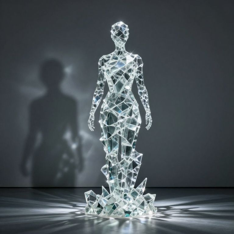 A mesmerizing 3D-rendered sculpture of translucent glass fragments forms a towering, ethereal structure that bends light into dynamic, ghostly shadows, evoking the presence of unseen figures in a dramatic, atmospheric setting.