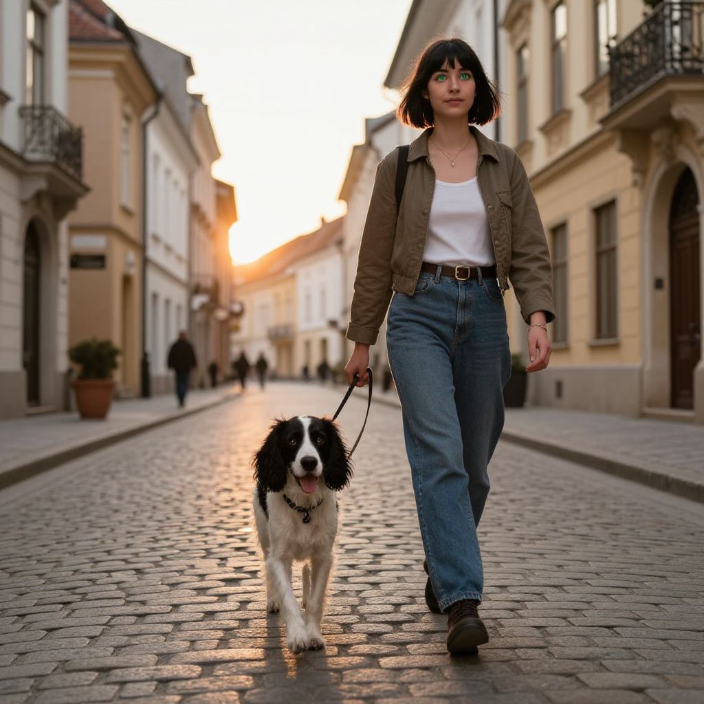 A energetic springer spaniel is being walked by a young woman with short black hair and bright green eyes, heading down a cobblestone street in a quiet European town, with vintage buildings and a warm golden sunset behind them.
