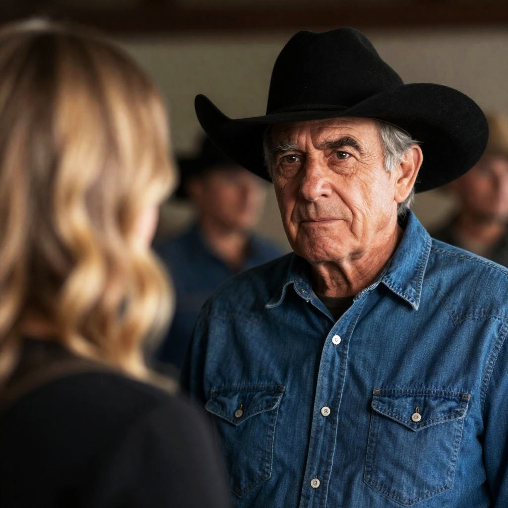Photograph of a middle-aged white man with grey hair and blue eyes, wearing a beige cowboy hat, brown coat with fur collar, and plaid shirt. He has a serious expression, looking slightly to the left. Background is dimly lit with a dark painting on the wall.