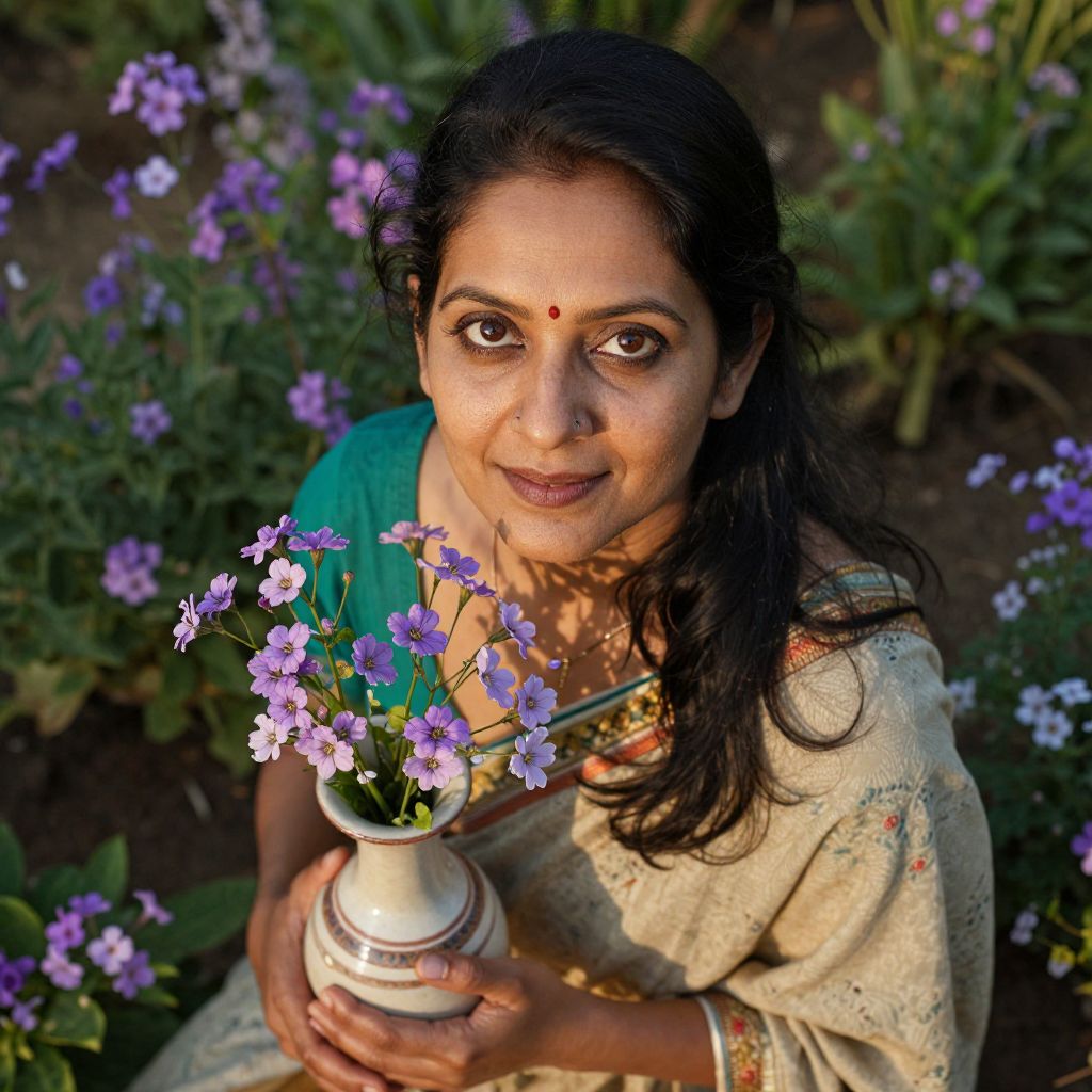 A serene South Asian woman with captivating brown eyes and a wise, warm expression sits amidst vibrant purple flowers in a lush garden. Soft golden sunlight illuminates her porcelain skin, highlighting subtle age lines that speak of a life full of grace. Captured from an unconventional bird's-eye view, she gracefully holds a delicate ceramic vase filled with fresh blooms - symbolizing beauty and resilience. This captivating portrait seamlessly blends tranquility and nature with the profound depth of human experience, inviting viewers into an intimate connection with this enchanting figure.