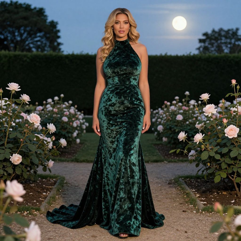 A cinematic portrait of a tall woman with a warm golden complexion, wavy blonde hair, and a serene expression, dressed in a stunning green velvet gown with a high neckline and flowing train, standing in an elegant garden at twilight, surrounded by roses and green foliage, the costume glowing under the soft moonlight with subtle folds and texture captured in realistic photography style.. The woman has big tits and cute face