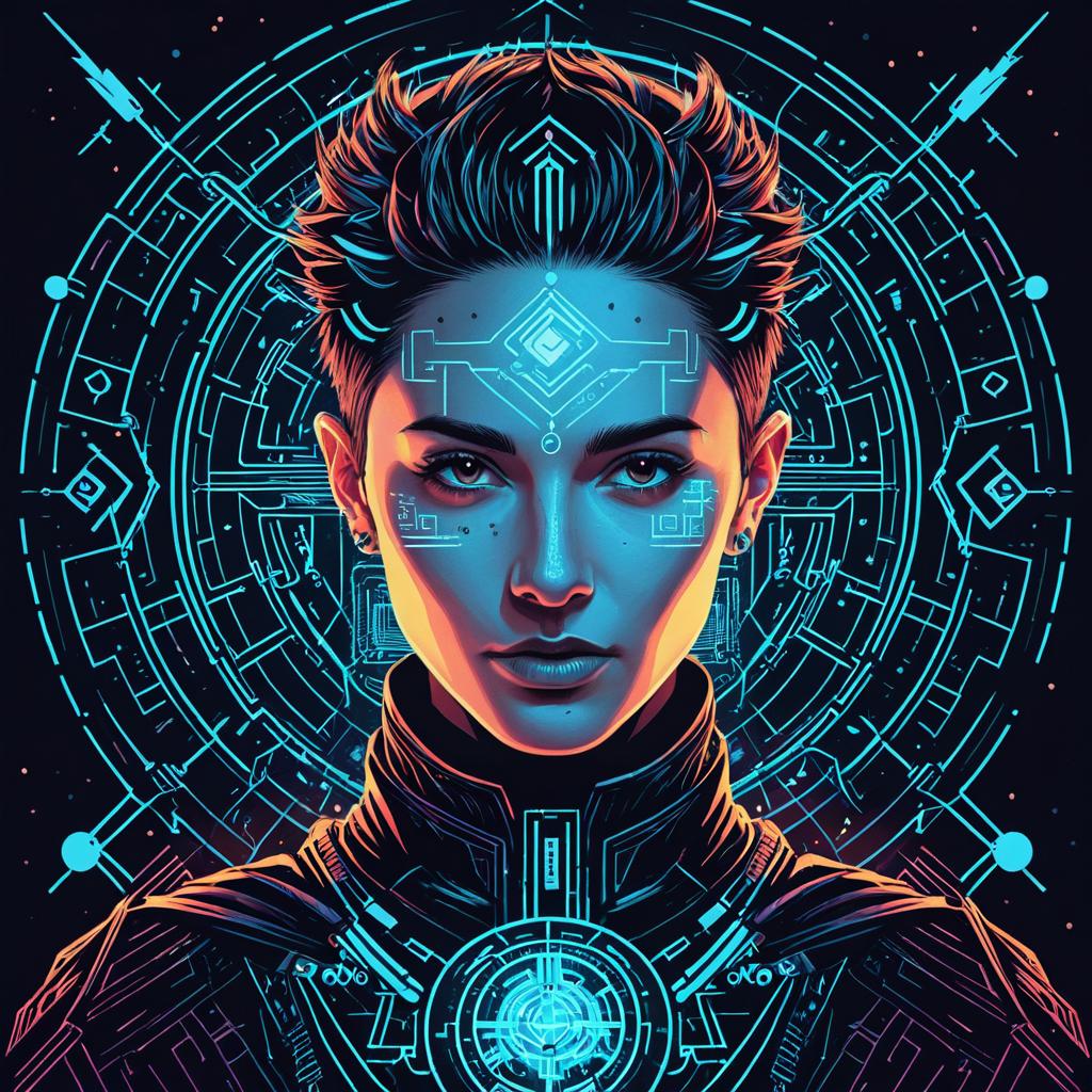 Vector art Create a portrait of a queer genderfluid technomancer that embodies cybernetic non-binary beauty, technology, and futurism, while pushing the boundaries of traditional aesthetics. Incorporate elements such as circuitry sigils, glowing runes. Draw inspiration from Olaf Najtewek, Charis Tsevis, Malika Favre.