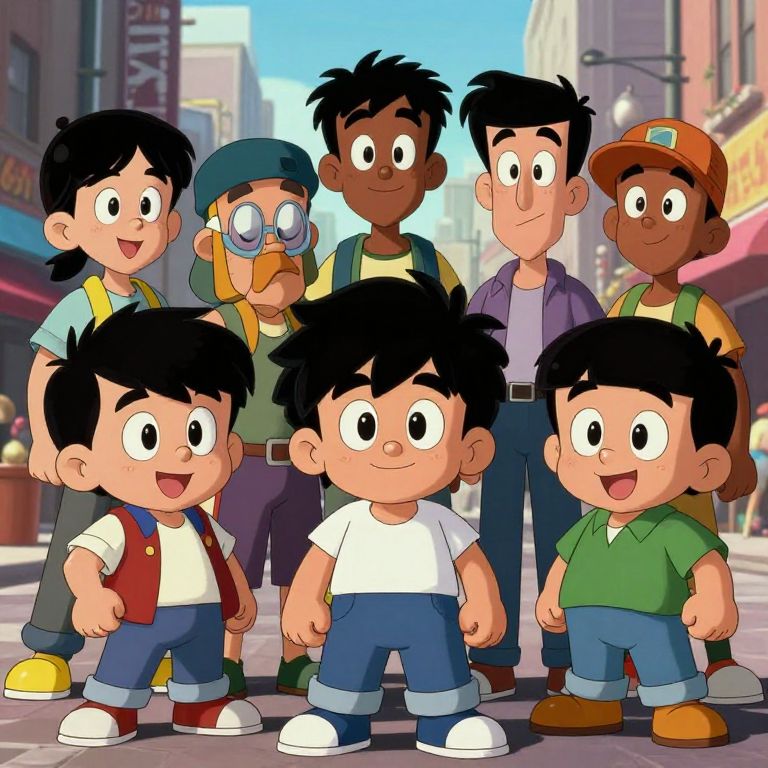 Group of cartoon characters with black hair, diverse styles and outfits, standing in a lively urban street scene, exaggerated features and playful expressions, inspired by classic 90s animation, high detail textures and vivid color palette, dramatic lighting effects