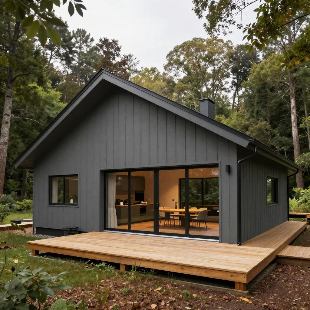 Modern grey ranch house nestled in a forest clearing, large glass doors opening to a wooden deck, minimalistic design blending with natural surroundings