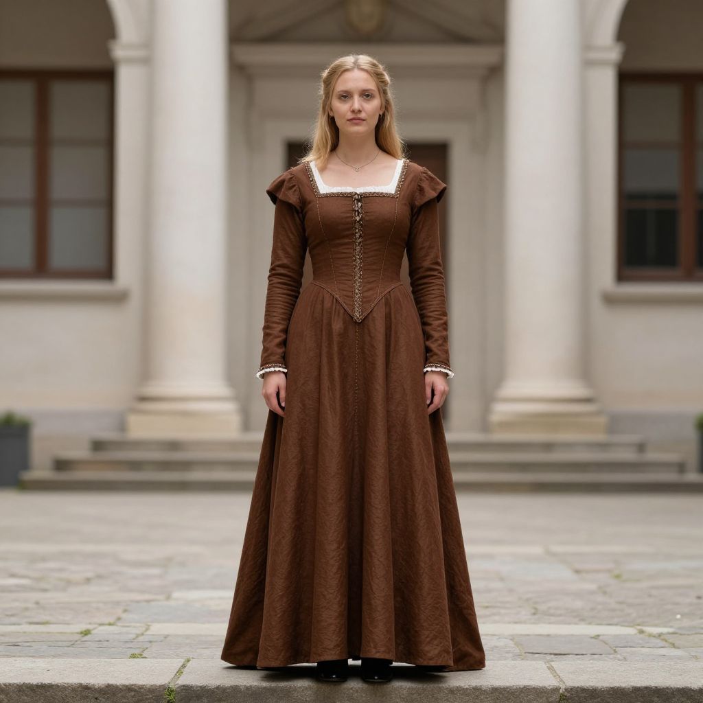Brown Medieval Dress, a woman in a brown dress standing in front of a building
