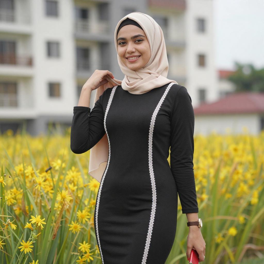 Photograph of a smiling young woman with light skin and dark hair, wearing a beige hijab and a tight black dress with white lace accents. She holds a beige scarf over her shoulder, standing among vibrant yellow flowers, with a modern apartment building in the background. She has a watch on her left wrist and a red object in her right hand.