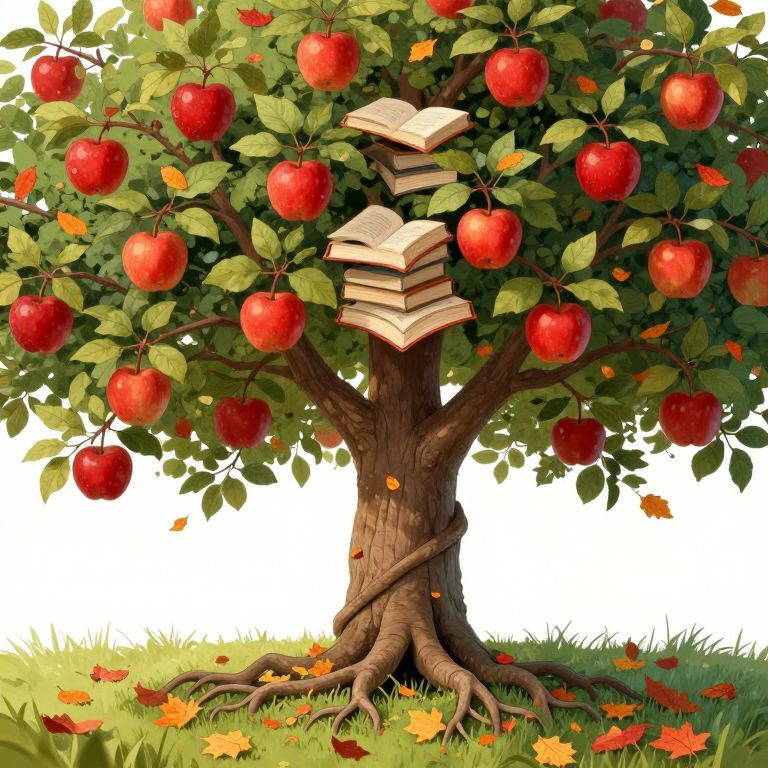 Digital illustration of a lush apple tree with vibrant red apples and green leaves, standing on a grassy patch with scattered orange and red leaves. Stacked open books are perched on the thick, gnarled trunk, adding a whimsical touch. The background is a bright, white gradient. The tree's bark is textured, and the apples are glossy, contrasting with the detailed, realistic leaves. The overall style is colorful and slightly fantasy-like, with a focus on nature and learning.