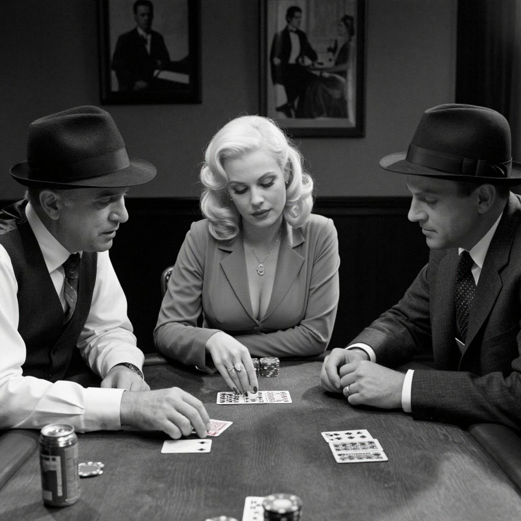 In this black-and-white film noir scene, three individuals are engrossed in a game of poker at a wooden table. The woman, positioned centrally, exudes elegance with her blonde hair styled in waves, a low-cut top, and a necklace. To her left, an older man in a fedora and vest leans forward, his hands resting on the table, while to her right, another man in a suit and fedora gazes intently at the cards. The table is adorned with several playing cards and a small can, possibly containing cigarettes. The background features a wall with framed pictures, adding to the vintage ambiance. The lighting casts dramatic shadows, enhancing the noir aesthetic, and the overall composition suggests a tense, suspenseful atmosphere.