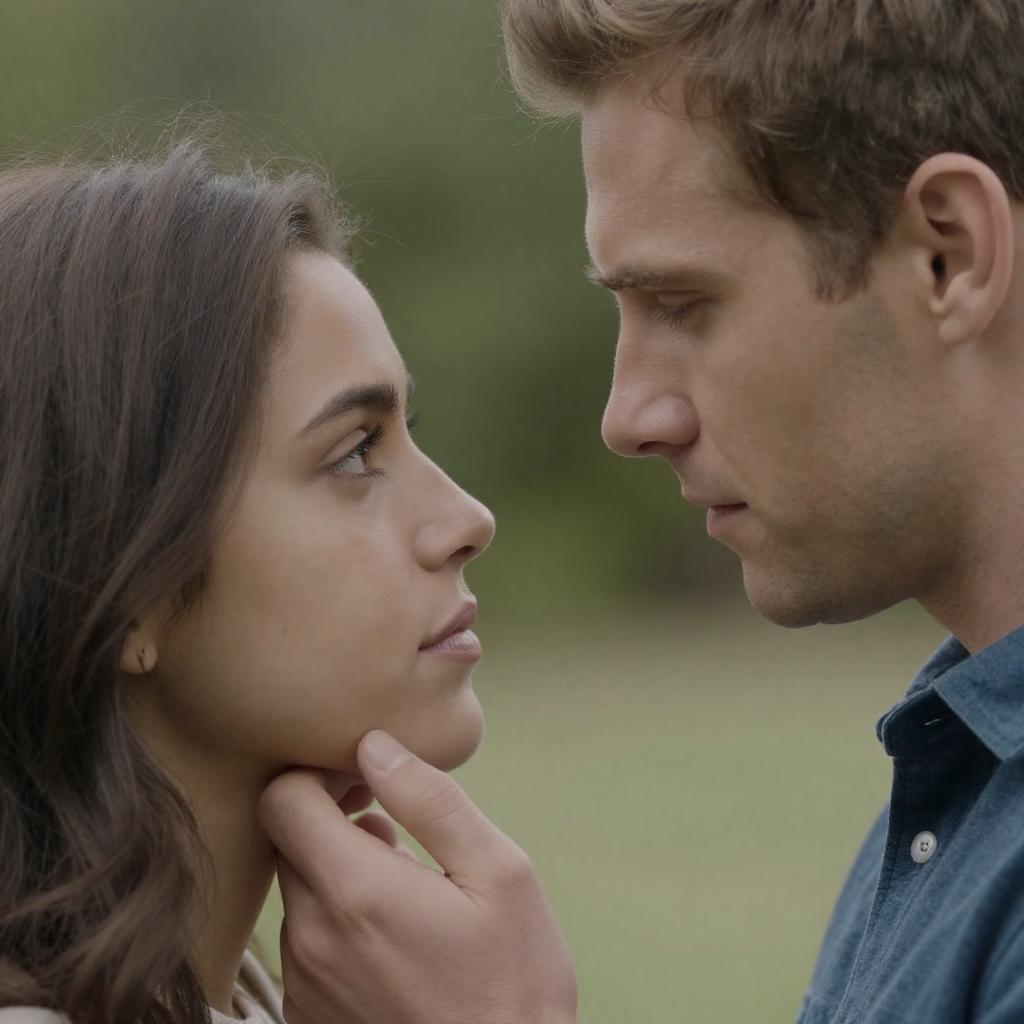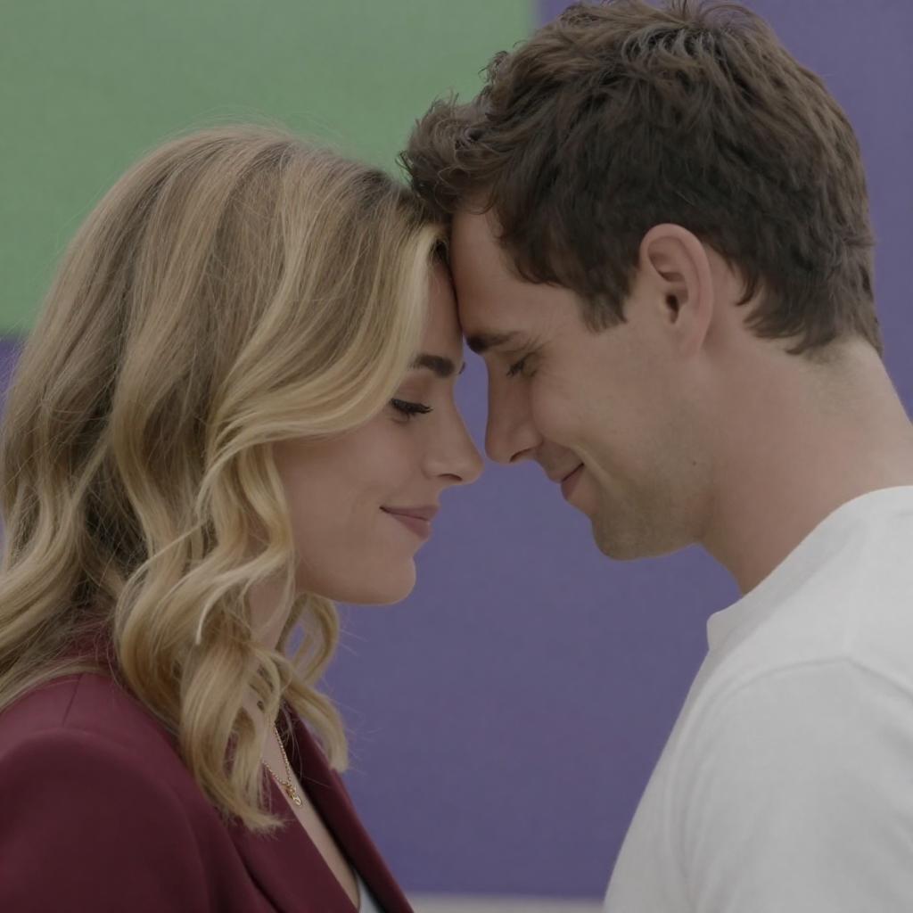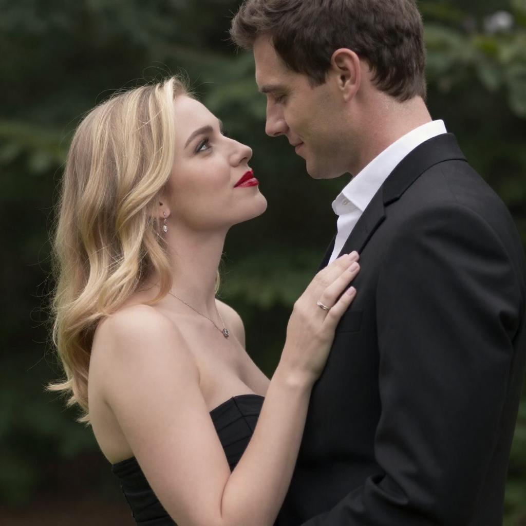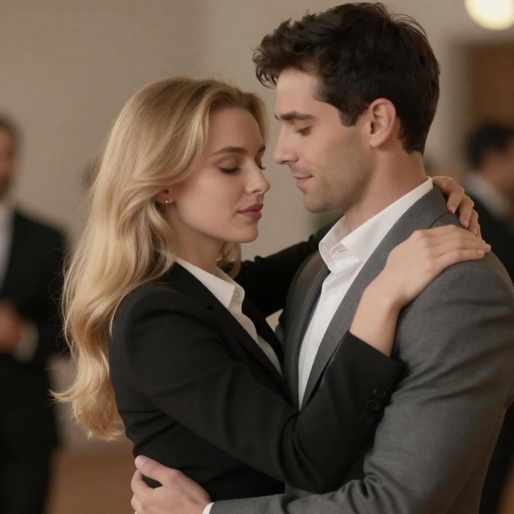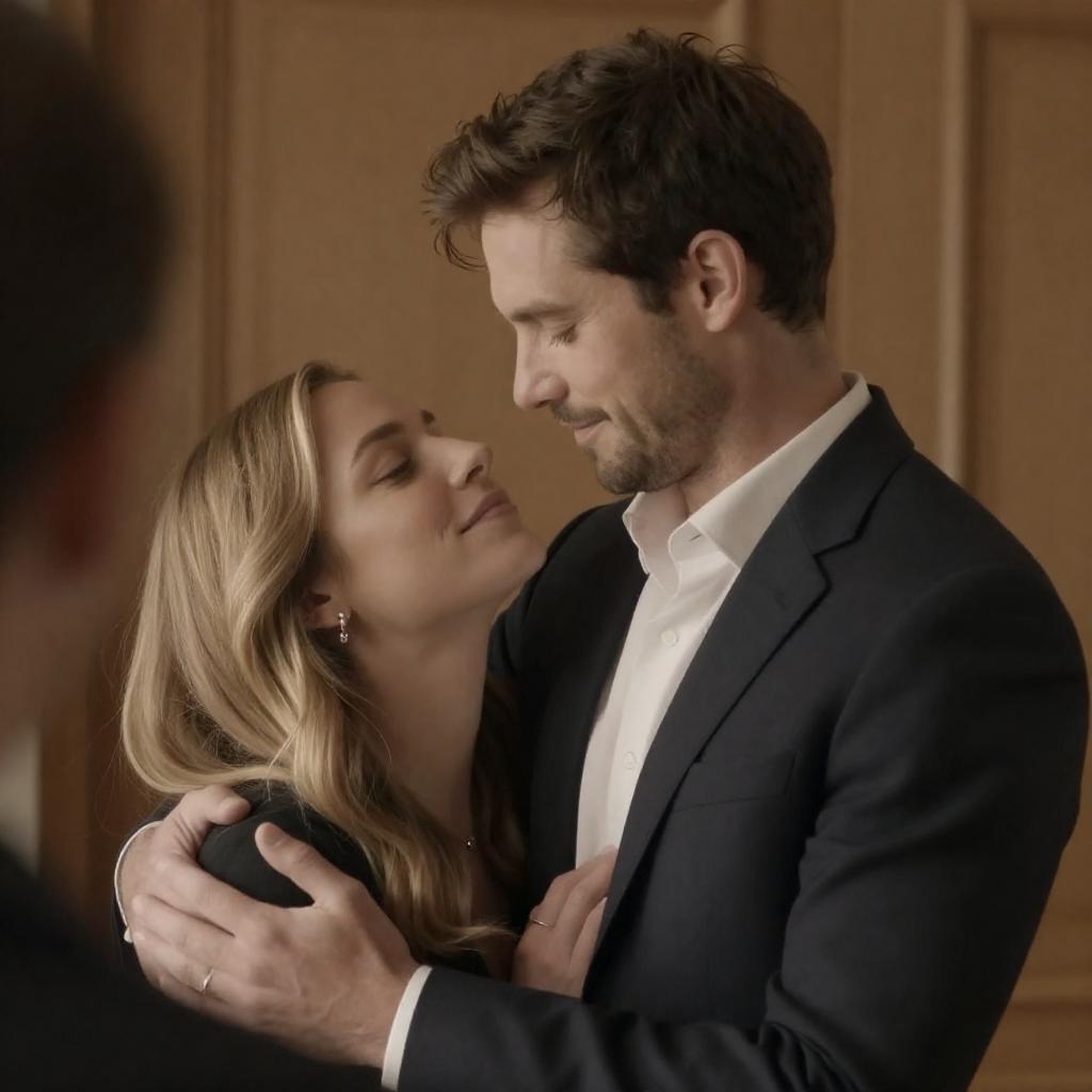 Photograph of a couple in an intimate moment. Blonde woman in white lace dress, man in black suit with white shirt, close to face, eyes nearly touching. Soft yellow lighting, blurred background, man's hand on woman's chin.