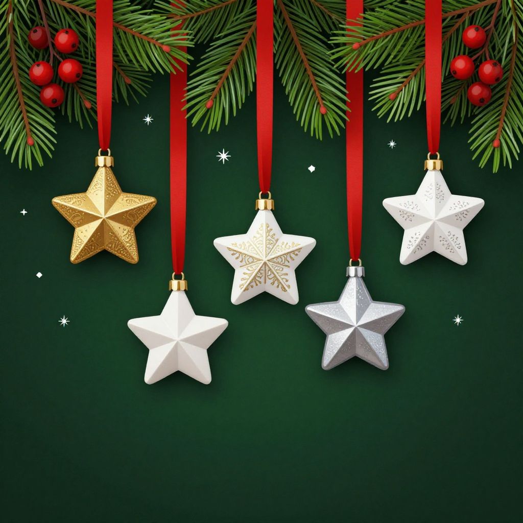 Digital illustration of five star-shaped ornaments, three white and two gold, hanging from red ribbons against a dark green background, with pine branches and red