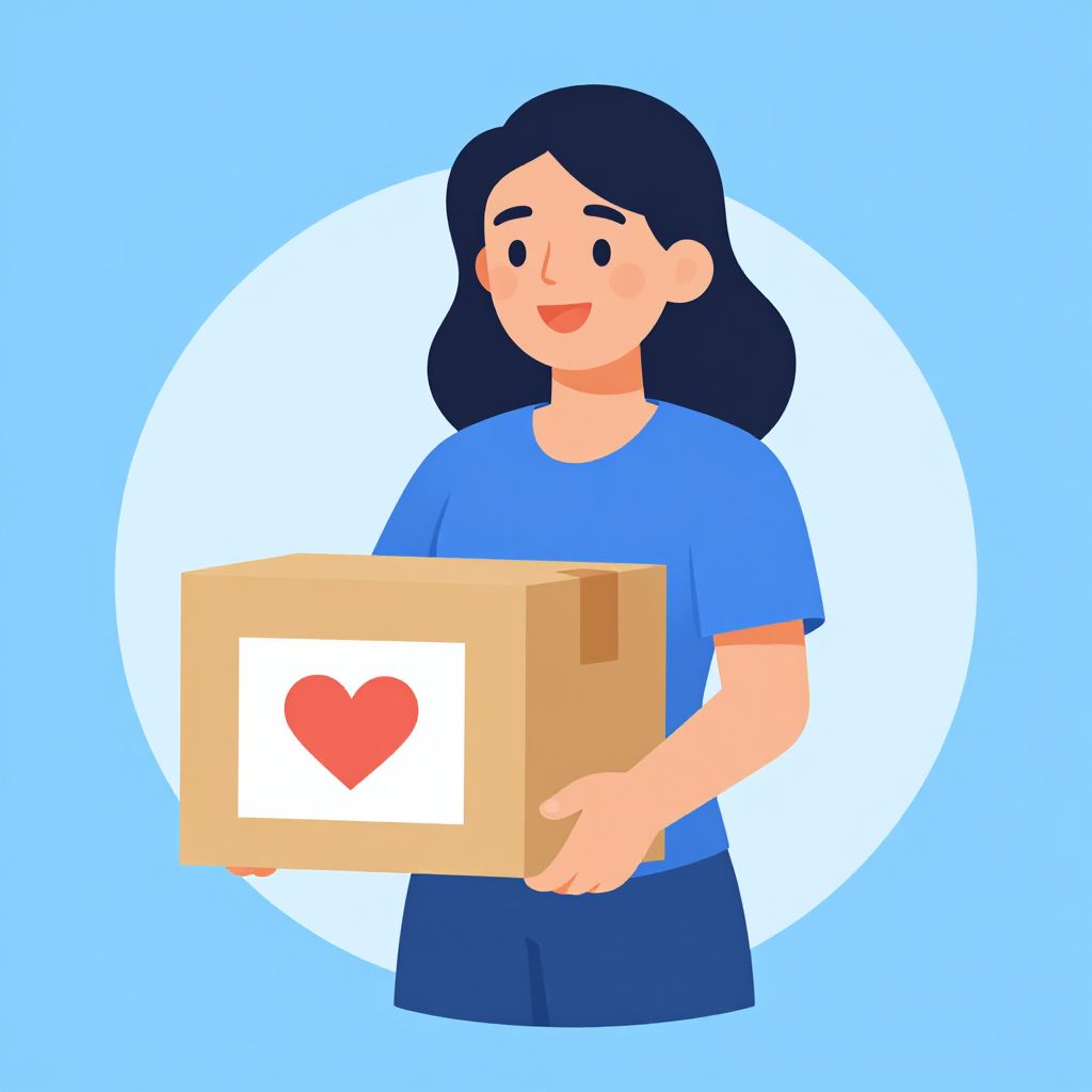 Cartoon-style illustration of a smiling woman with black hair, blue shirt, and dark blue pants, holding a cardboard box with a red heart sticker,