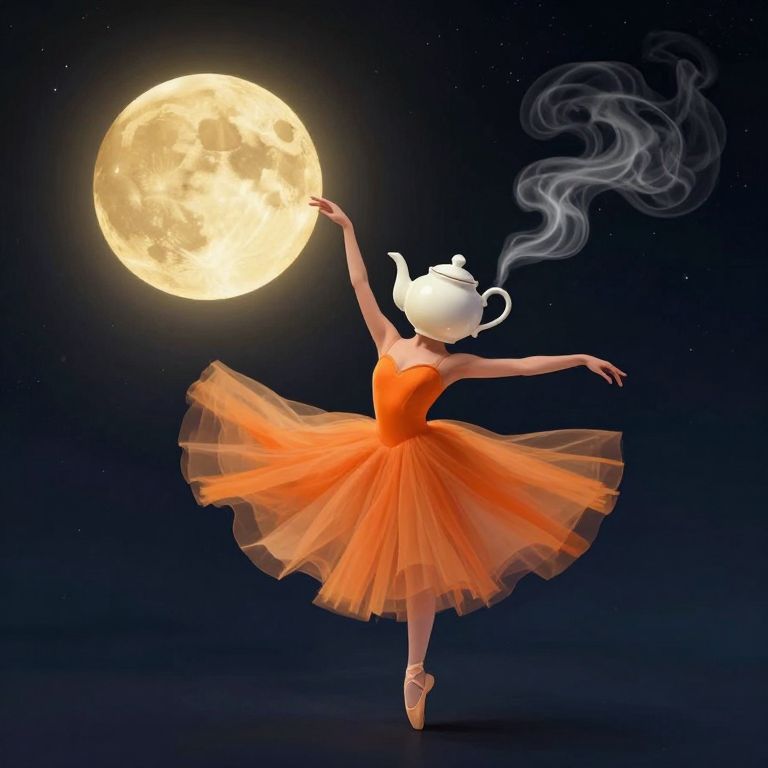 In a whimsical digital art rendering, a teapot-headed figure in a flowing orange tutu dances gracefully under a golden moon, with ethereal steam swirling into balletic forms against a starry night sky, evoking a magical, dreamlike atmosphere.