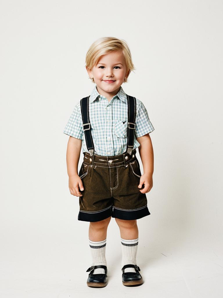 Full body portrait of a smiling toddler boy with blonde hair wearing traditional brown lederhosen shorts with suspenders, a light blue and white checkered short-sleeve shirt, white knee-high socks with dark stripes, and black shoes. The boy stands against a plain white background with his arms behind his back.