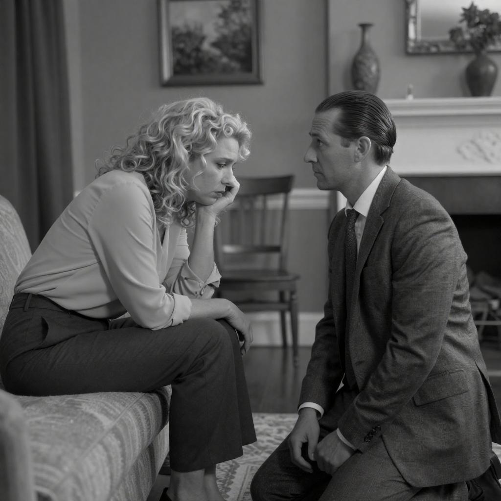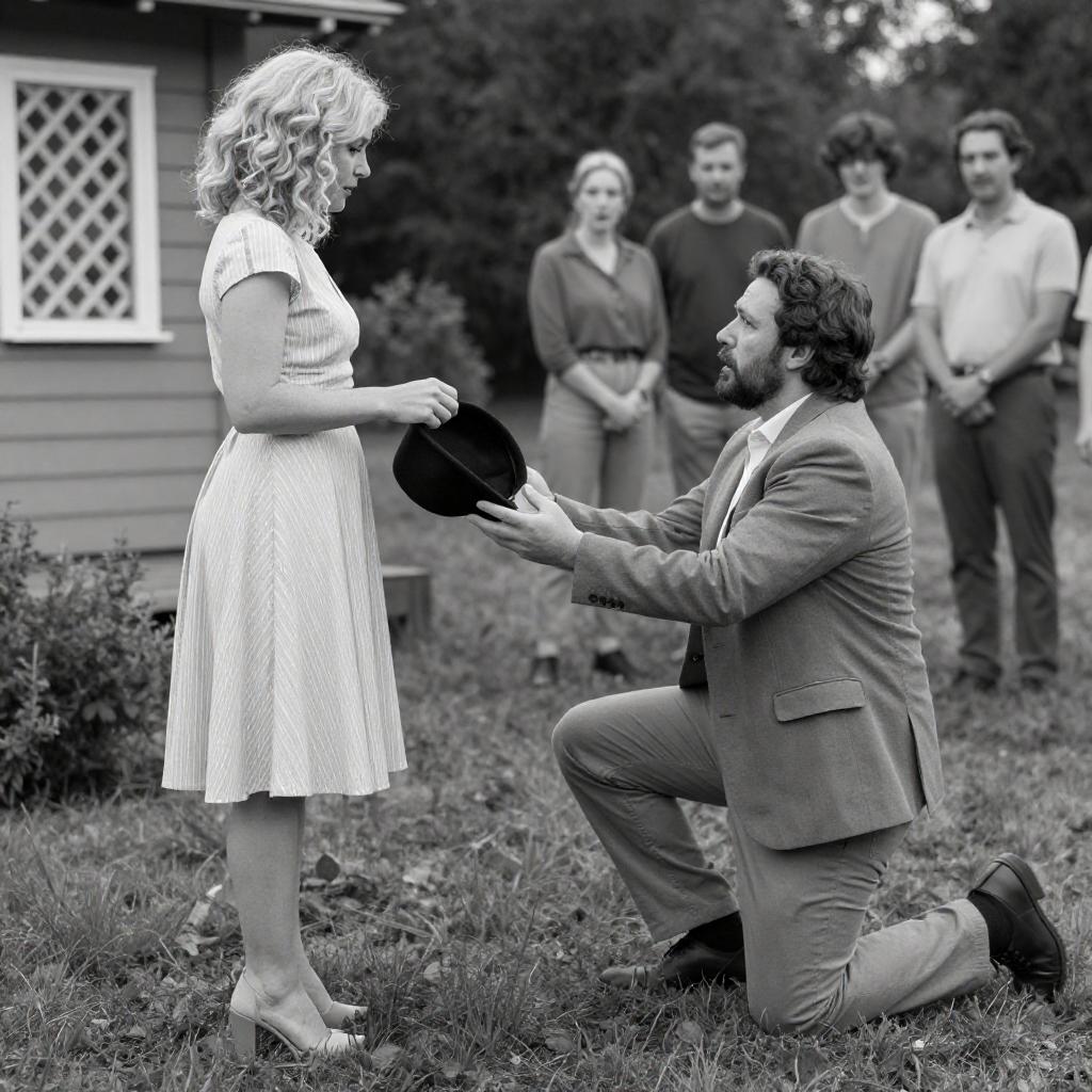 Black-and-white photograph. Man with dark hair, medium build, and beard, kneels on grass, reaching out to a woman with curly blonde hair, light skin, wearing striped dress and high heels. She holds a black hat. Background includes people standing, small house with lattice windows, and trees. Man's intense expression, woman's surprised expression. Five other people in background, watching. Man's jacket and pants, woman's dress and shoes, grassy lawn, small bush in foreground.