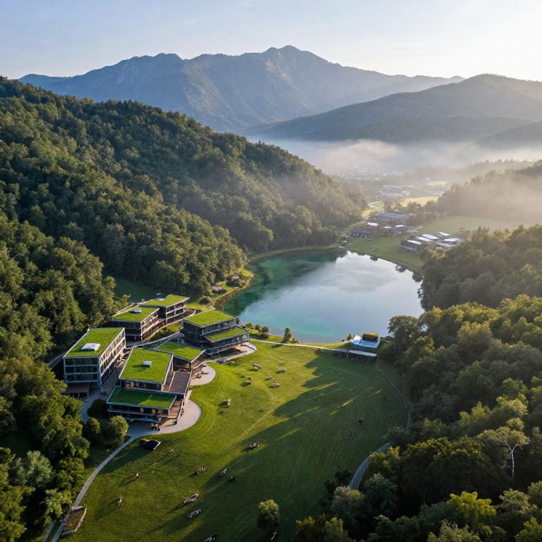 A panoramic aerial view of Columbu nestled between lush forests and crystal-clear lakes, majestic mountains in the distance, modern eco-friendly buildings with green rooftops, wildlife roaming freely, soft mist rising at sunrise, highly detailed and serene natural beauty blending with architecture.