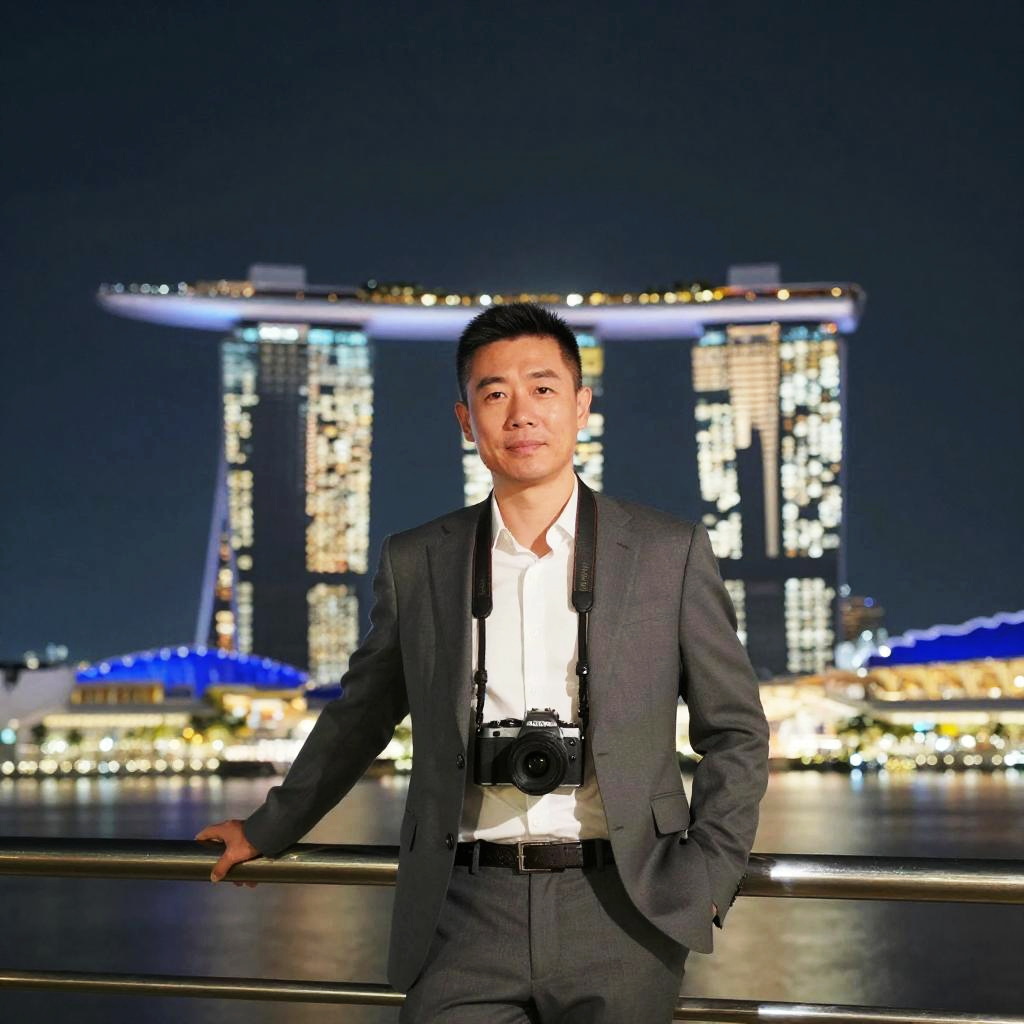Photograph of an Asian man in a gray suit, white shirt, and camera around neck, standing at night with Marina Bay Sands illuminated in the background