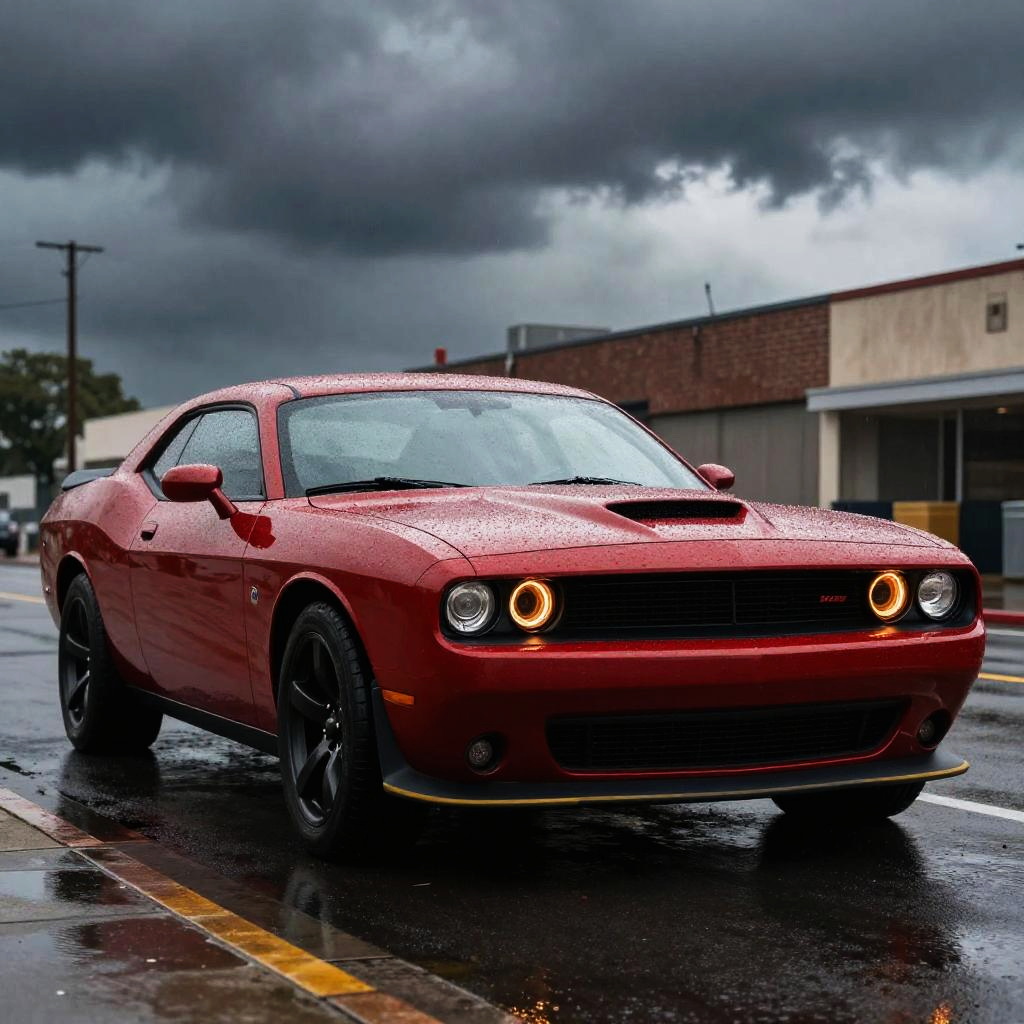 Dark red Dodge muscle car parked on a rain-soaked street under a stormy sky, water droplets glistening on the polished surface, dramatic lighting highlighting the bold grill and wide tires, gritty urban background with a moody atmosphere.
