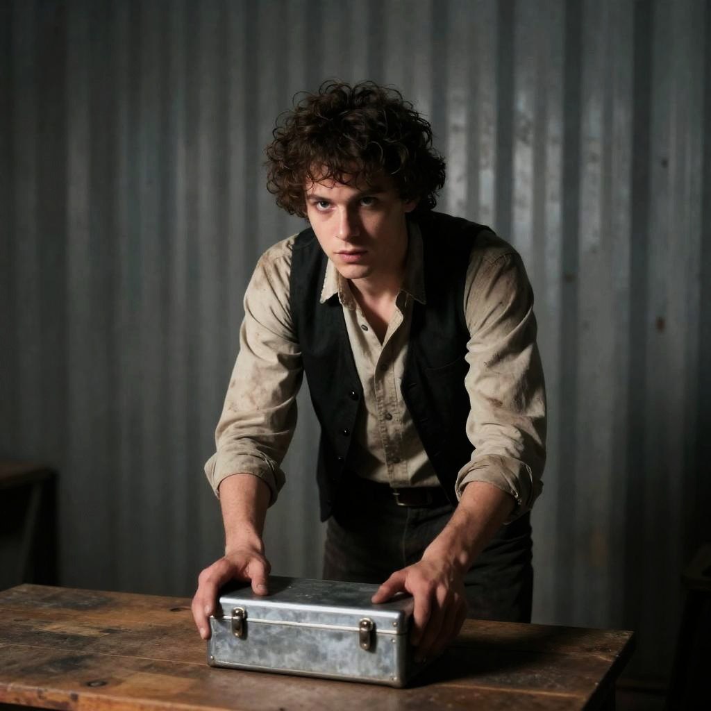 Photorealistic image of a young man with curly brown hair wearing a green military-style jacket and a red shirt underneath. He is pressing his hands against a gray paneled wall with an intense expression and his mouth slightly open. Sunlight from a nearby window casts shadows on the wall. A wooden door is visible in the background.