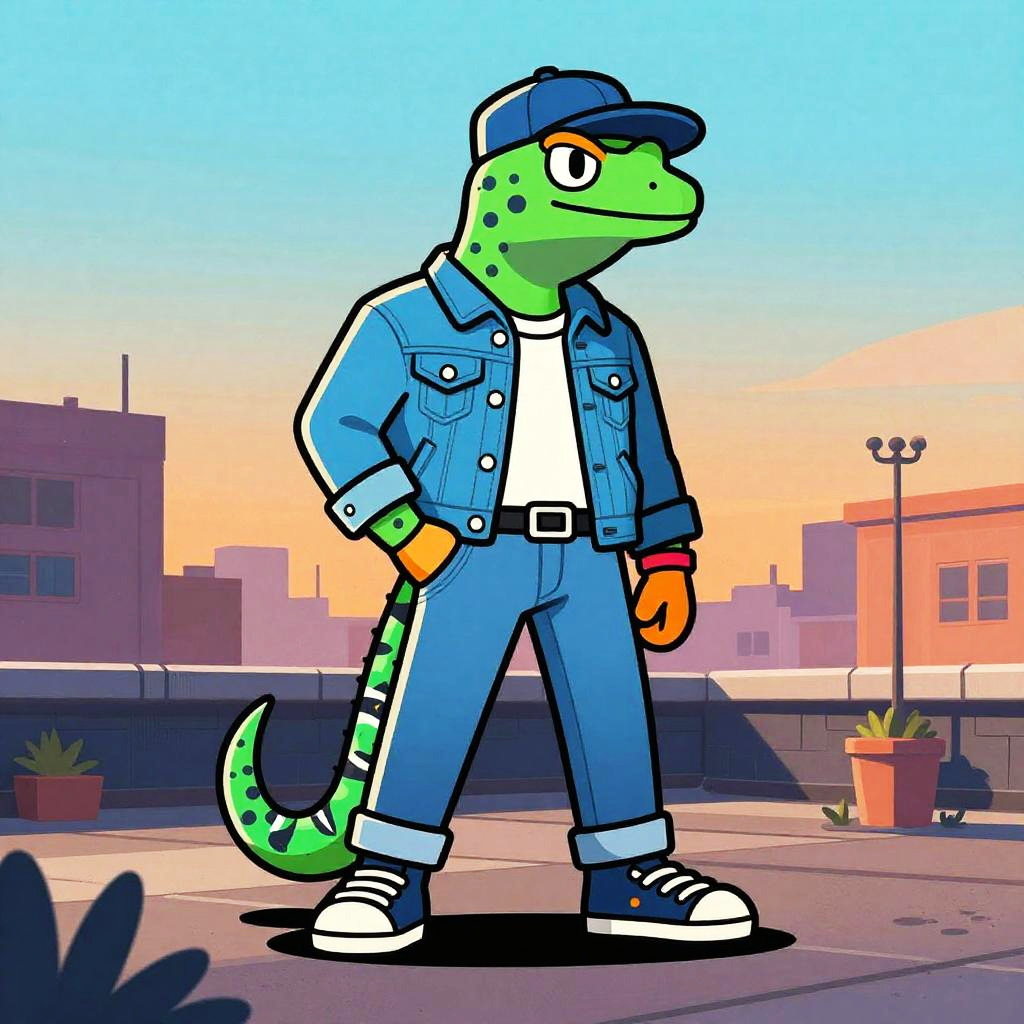 Realistic photo. A vibrant cartoon illustration of a streetwise gecko graffiti artist at urban rooftop garden, bold black outlines, clean cel shading, crisp cutout edges; denim jacket, slim jeans, canvas sneakers, snapback and wristbands. Relaxed, expressive pose, confident tilt, exaggerated proportions, chunky silhouette; modern, slightly abstract shapes, minimal clutter; simple gradient backdrop, tidy shadows, soft rim light. Dominant bright cyan and sunset orange with high-contrast accents; playful retro hip-hop vibe, halftone speckles, subtle paper grain.