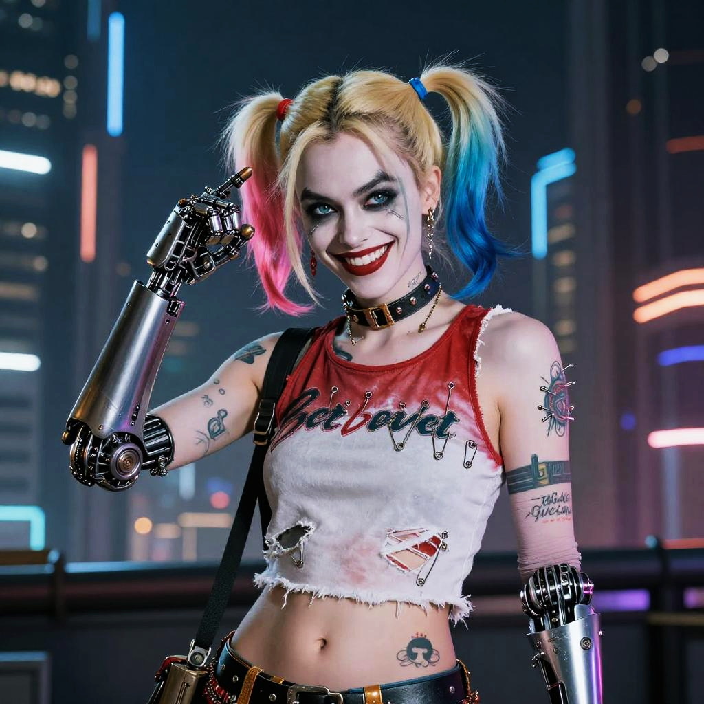 Harley Quinn punk with robotic arm, futuristic cyberpunk cityscape, glowing tattoos, ripped clothes with safety pins, smirking with mischievous eyes, high contrast lighting, sci-fi influence