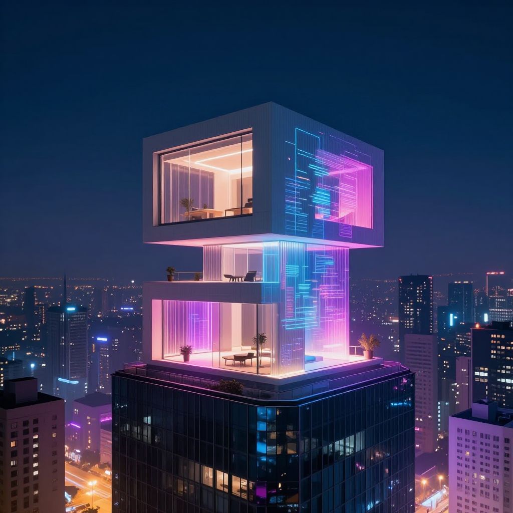 AI generated house, minimalist futuristic urban dwelling atop a skyscraper, sharp geometric shapes, illuminated by neon lights and holographic projections, night cityscape background with vivid colors, hyper-realistic rendering, sci-fi vibes