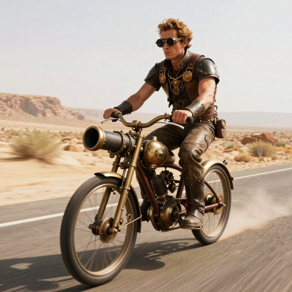 A young man wearing round goggles and steampunk leather armor rides an intricate, brass-accented monocycle with a cannon attachment. The scene is set on a desert road with arid, rocky landscapes in the background. The man’s attire includes metal-studded shoulder armor, arm bracers, and leather pants, embodying a dynamic steampunk aesthetic.