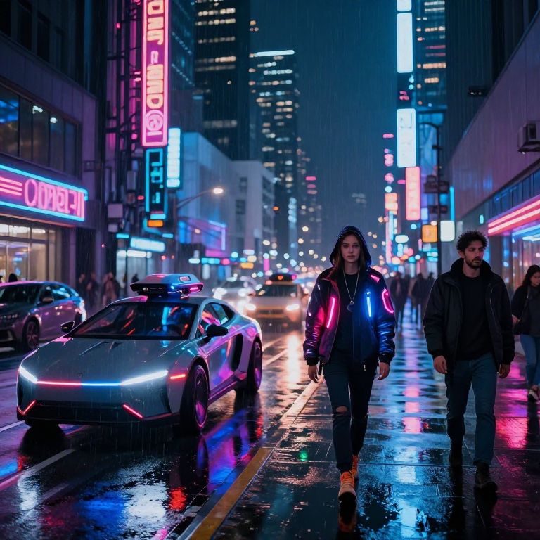 Neon-lit, rainy urban night scene photograph featuring a woman in a neon jacket and a man in a leather jacket walking beside a glowing, futuristic