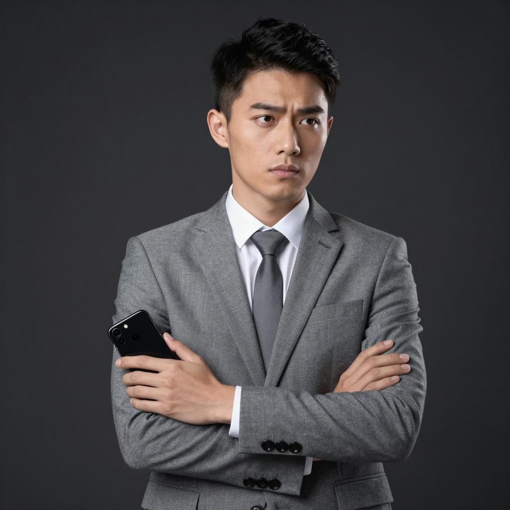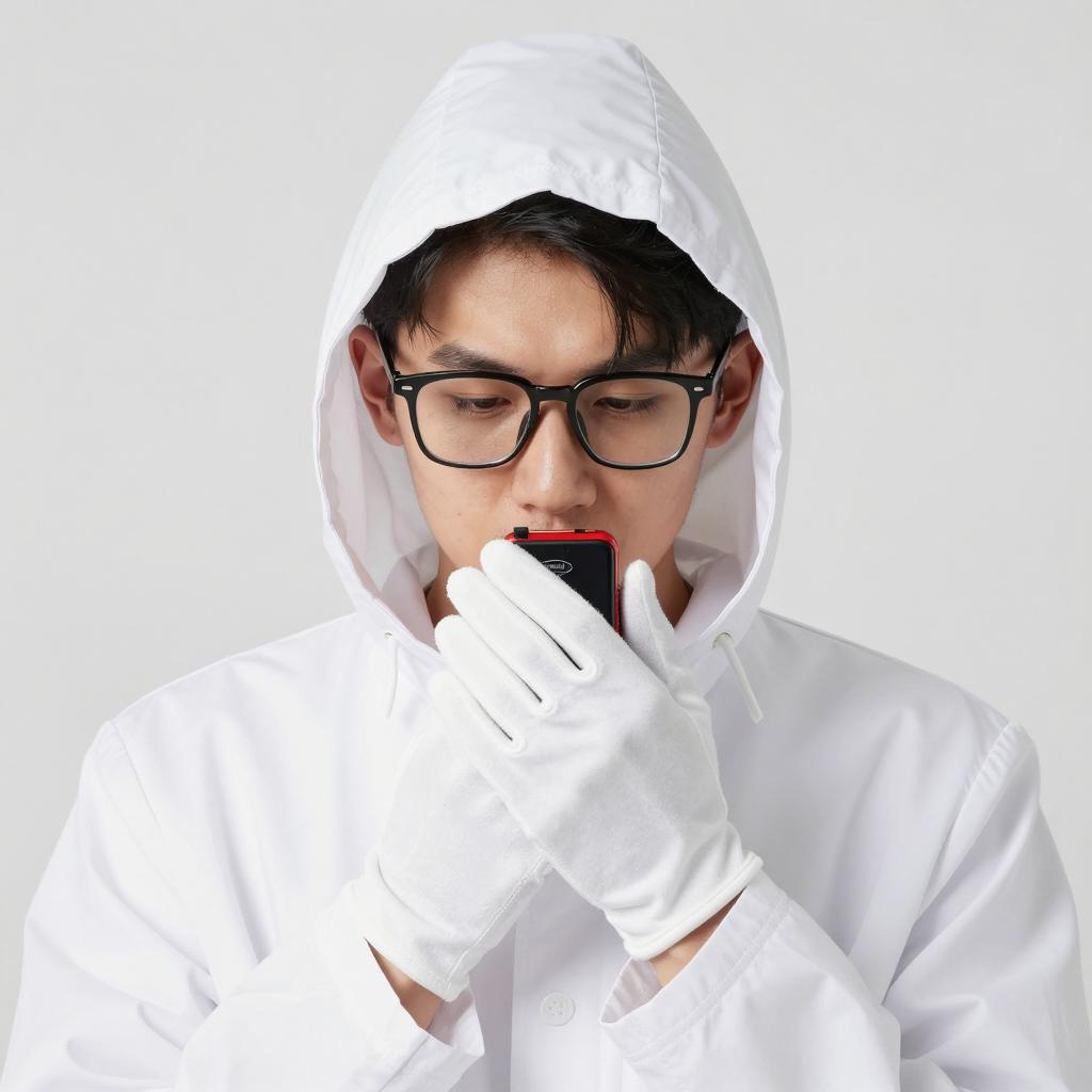 A man wearing a white hooded suit and black-rimmed glasses, holding a small black and red device to his mouth with white gloved hands. His eyes are focused downward. The background is plain white.