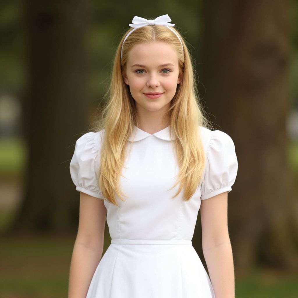 Photograph of a young blonde Caucasian girl with fair skin, standing in a blurred outdoor setting with tall trees in the background. She has long, straight hair adorned with a white ribbon bow. She wears a white, short-sleeved, knee-length dress with a V-neck and a slightly puffed, fitted waist. She has a gentle smile, blue eyes, and minimal makeup. The bright sunlight highlights her hair and dress, creating a soft, natural glow. The overall composition emphasizes her innocence and purity, with a serene, natural background.
