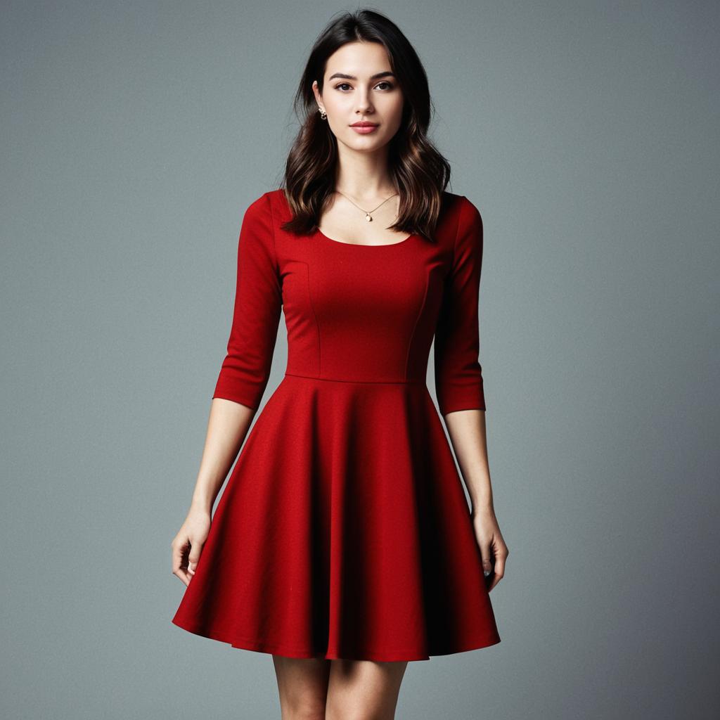 Woman, casual chic, solid red skater dress, scoop neckline, three-quarter sleeves, fitted waist, flared skirt above the knee, plain backdrop.