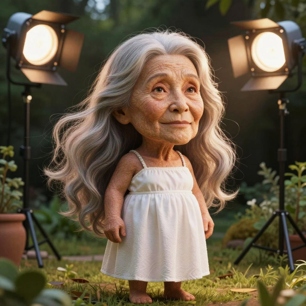 Photograph of a digitally created, cartoonish elderly woman with exaggerated features, standing in a garden. She has long, wavy gray hair, wrinkled skin, and a small, round face with a gentle smile. She wears a simple, white, sleeveless dress. Three bright studio lights with black stands are positioned in the blurred background, illuminating her. The garden has green grass, potted plants, and foliage, creating a natural, outdoor setting. The lighting highlights her face and dress, adding a soft glow to the scene.