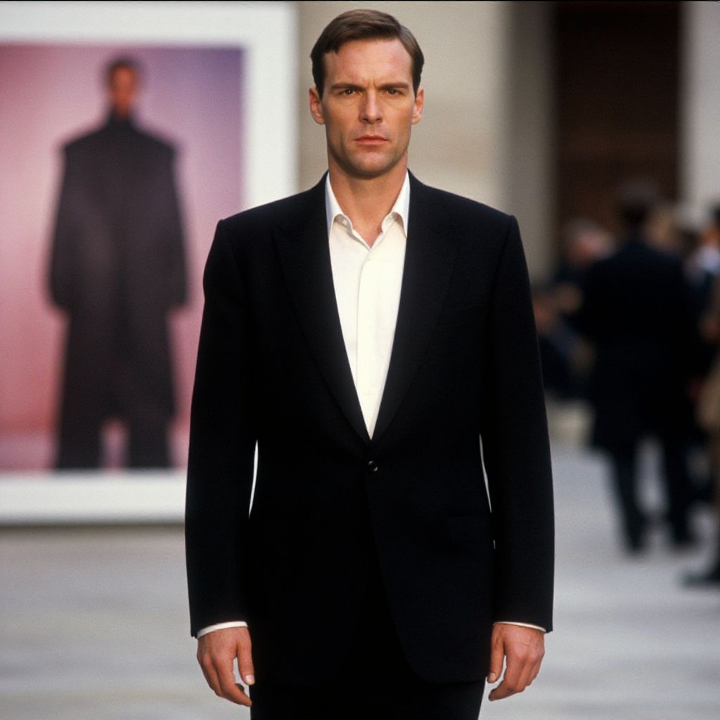 Medieval Art 1990 screengrab of male model G-Man wearing a black wool tuxedo with a single button closure and peak lapels, fashion movie scene, Balenciaga commercial,