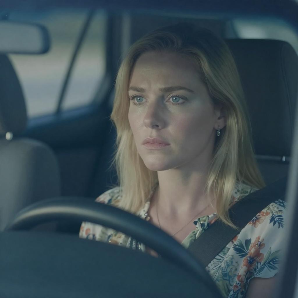 Photograph of a worried woman with short, messy brown hair, wearing a headset, and a grey strap across her chest. She has intense blue eyes and slightly open mouth. Background shows blurred, colorful bokeh lights on the left.