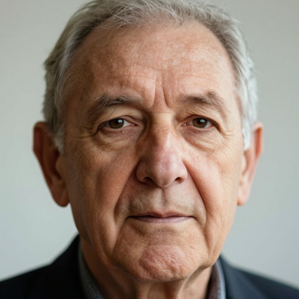 Close-up photograph of an elderly man with gray hair, wrinkles, and light skin, wearing a dark jacket, against a plain white background.