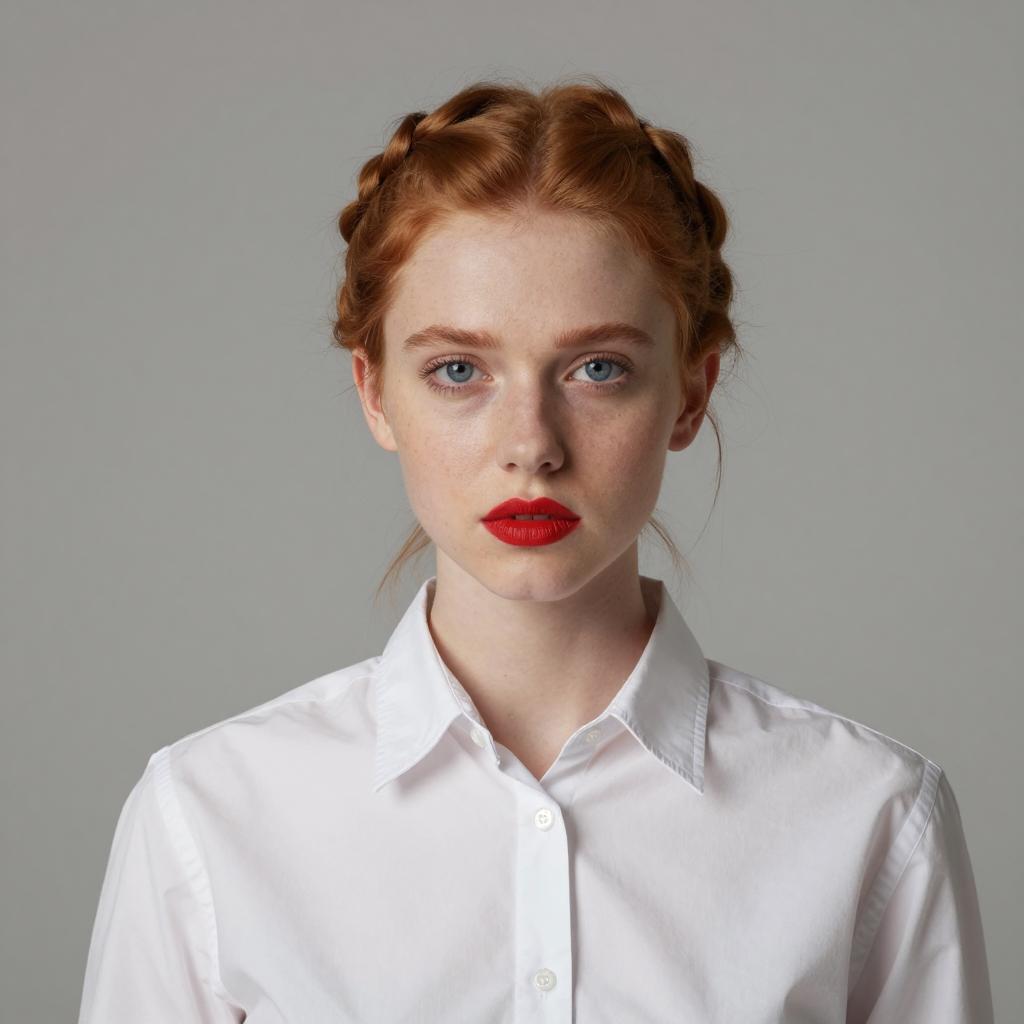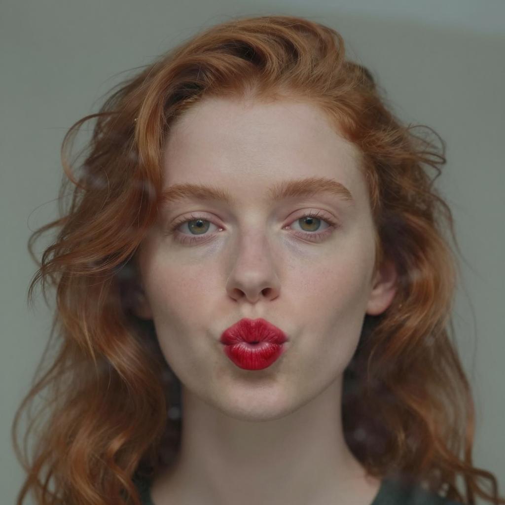 Photograph of a young woman with fair skin and curly red hair, viewed through a foggy glass surface. She has her lips puckered and pressed against the glass, with her eyes looking directly at the camera. Her red lipstick is prominently visible. The background is a muted greenish-blue.