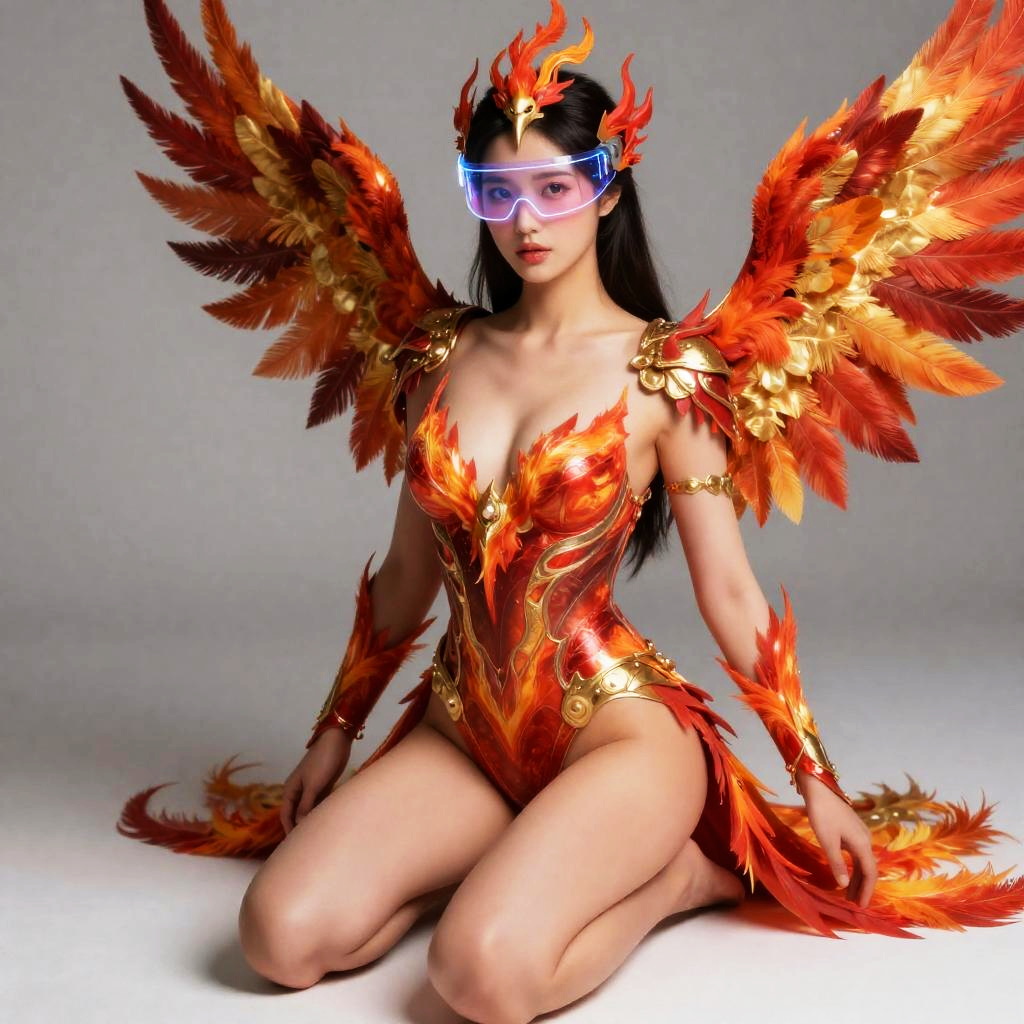Photograph of an Asian woman with long black hair, kneeling on the ground. She wears a fiery orange and red feathered costume with gold accents, resembling wings and a bodysuit. Her outfit reveals her cleavage and she has large, detailed feathered wings extending from her back. She also wears a golden headpiece with flames and futuristic purple and blue goggles. The background is a plain, light gray, which contrasts with her vibrant outfit. Her skin is light, and she has a focused expression. The overall style is fantasy-themed with a mix of futuristic and mythical elements.