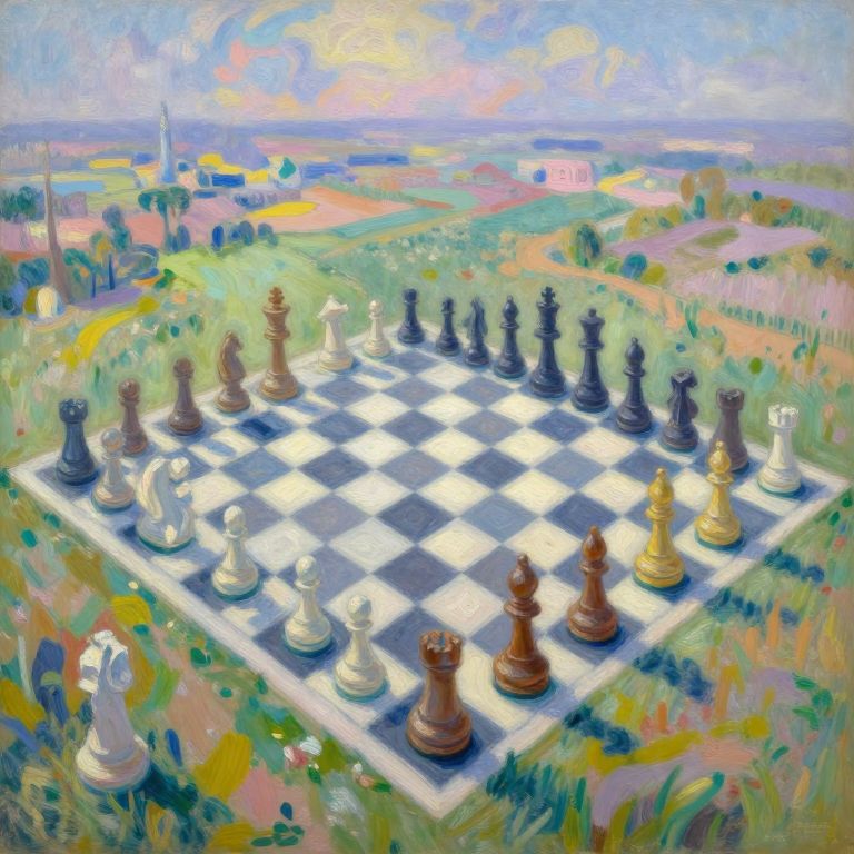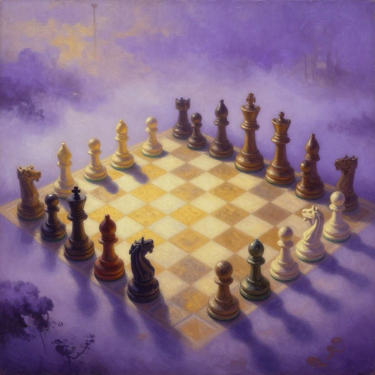 A surreal oil painting captures a whimsical chessboard landscape, where colossal, intricately detailed chess pieces cast elongated shadows across an ethereal misty plain. From a bird's eye perspective, the scene evokes grandeur and drama in this fantastical world, instilling a sense of wonder, mystery, and anticipation as the pieces prepare for their celestial game. The vibrant color palette oscillates between the tranquility of still morning mists and escalating tension of an impending cosmic battle, creating an emotional gradient with deep purples and golds dominating the scene.