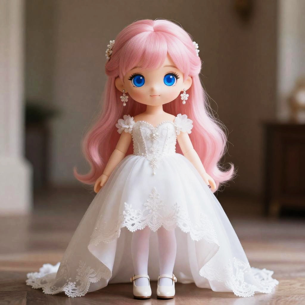 Photograph of a doll with long pink hair, blue eyes, wearing a white lace wedding dress, white stockings, and white shoes, standing in a
